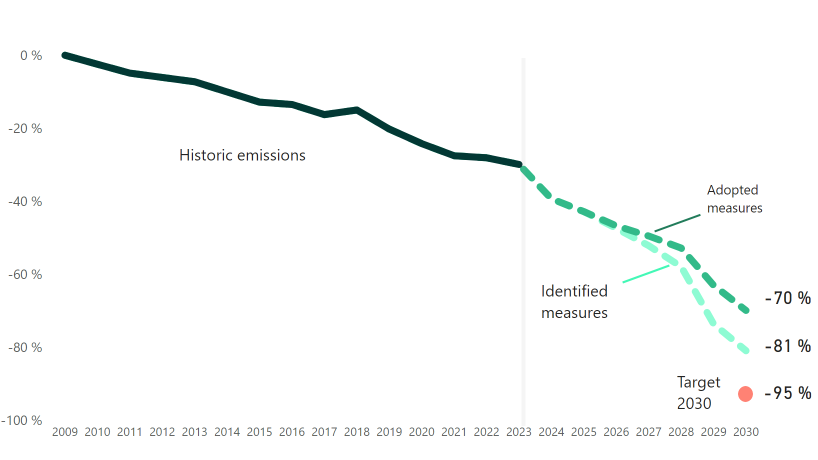 The Climate Budget 2026 shows that emissions can be reduced by 70% by 2030, compared with 2009 levels, with the adopted measures. Figure: The Climate Agency