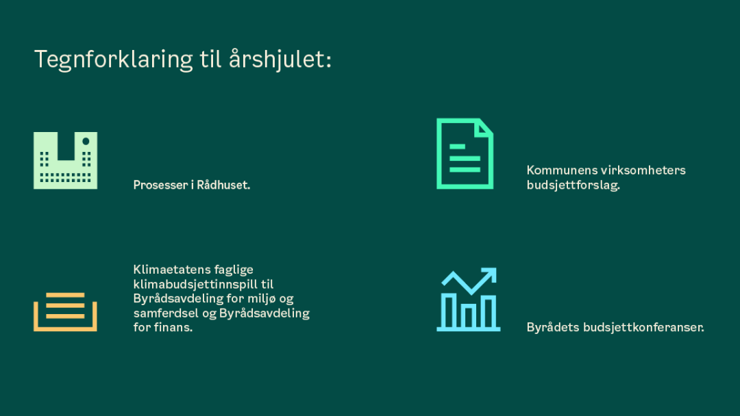 Oslo kommunes budsjettprosess involverer kommunens virksomheter og foregår hele året. Budsjettprosessen er koblet til arbeidet med den enkelte virksomhets strategiske plan, årsplan og årsberetning. Kommunens klimaarbeid er gjennomgående inkludert i denne prosessen, ved at klimabudsjettet er integrert i kommunens økonomiske budsjett. Scroll deg videre for å lære om årshjulet til klimabudsjettet.