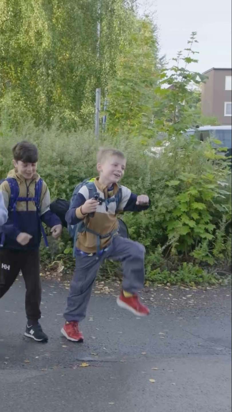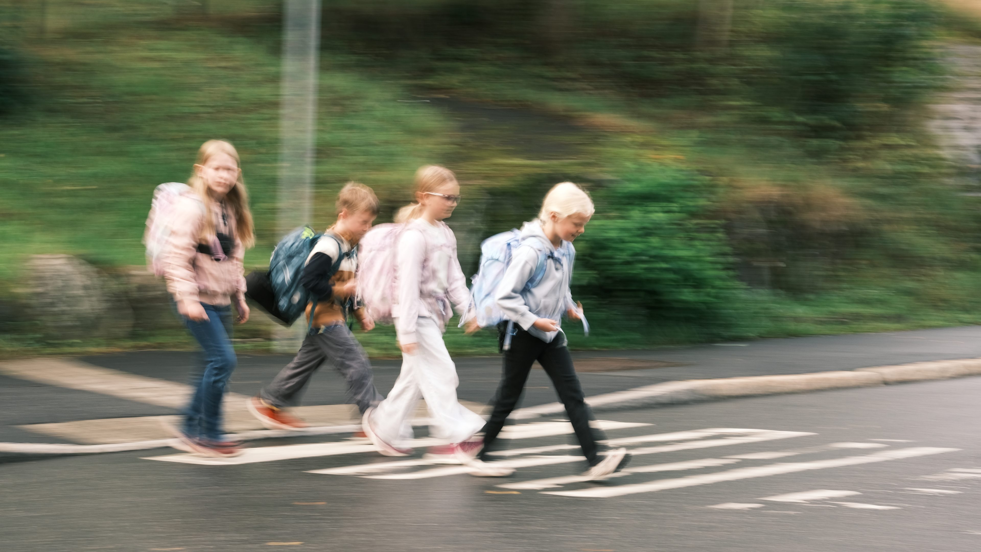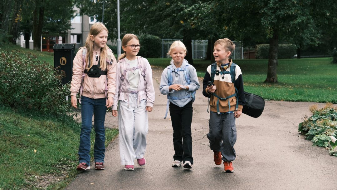 Det er grytidlig på en onsdag, og på Haugerud har fem skolekamerater akkurat ønsket hverandre god morgen. Nå står de klare med skolesekk og gode sko – klare til å rusle, skravle og leke hele veien til skolen.