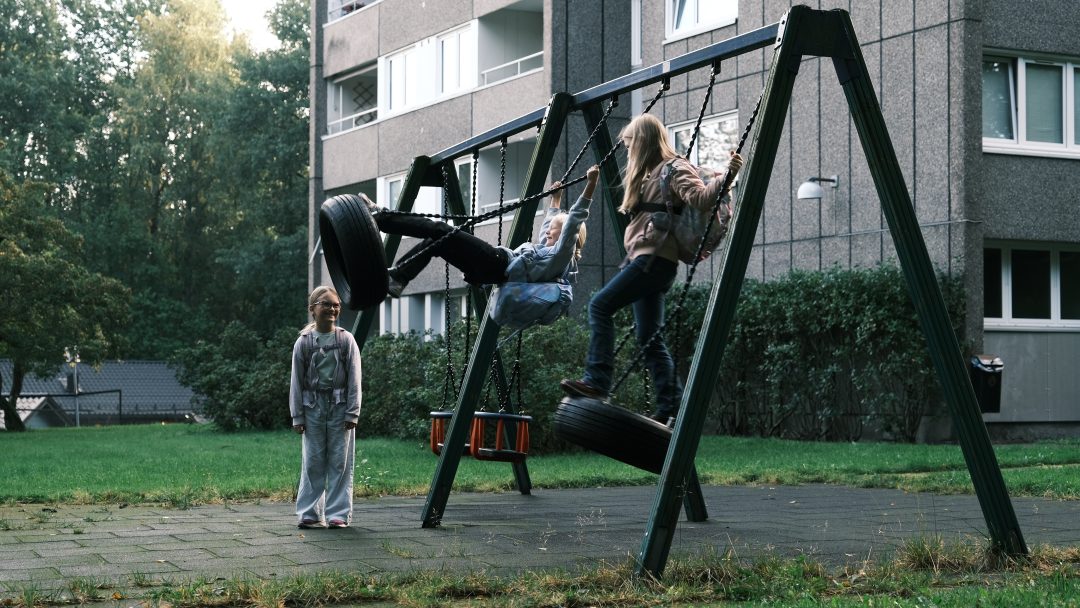 Barna på Haugerud tar gjerne en stopp ved den lokale lekeplassen på vei til skolen.