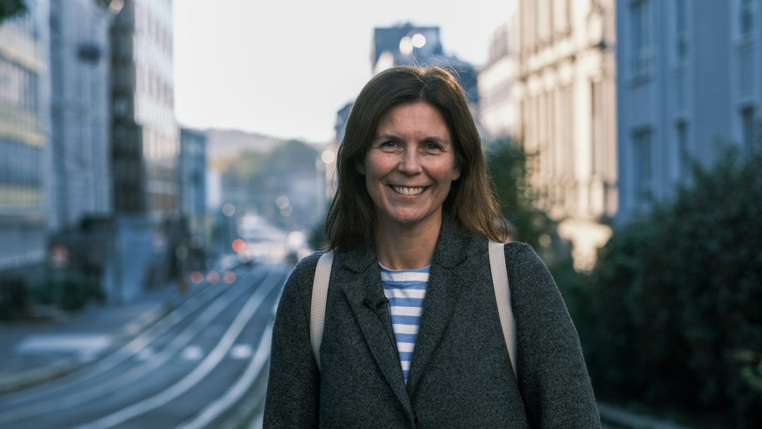Hun har for lengst oppdaget nærområdets gangvennlige bystruktur, og med lange klyv strener hun svært effektivt nedover Cort Adelers gate på vei til jobb. Her ser hun morgensolen stige opp over Akershus festning – et av høydepunktene på hennes daglige gåtur fra Frogner til Kvadraturen.