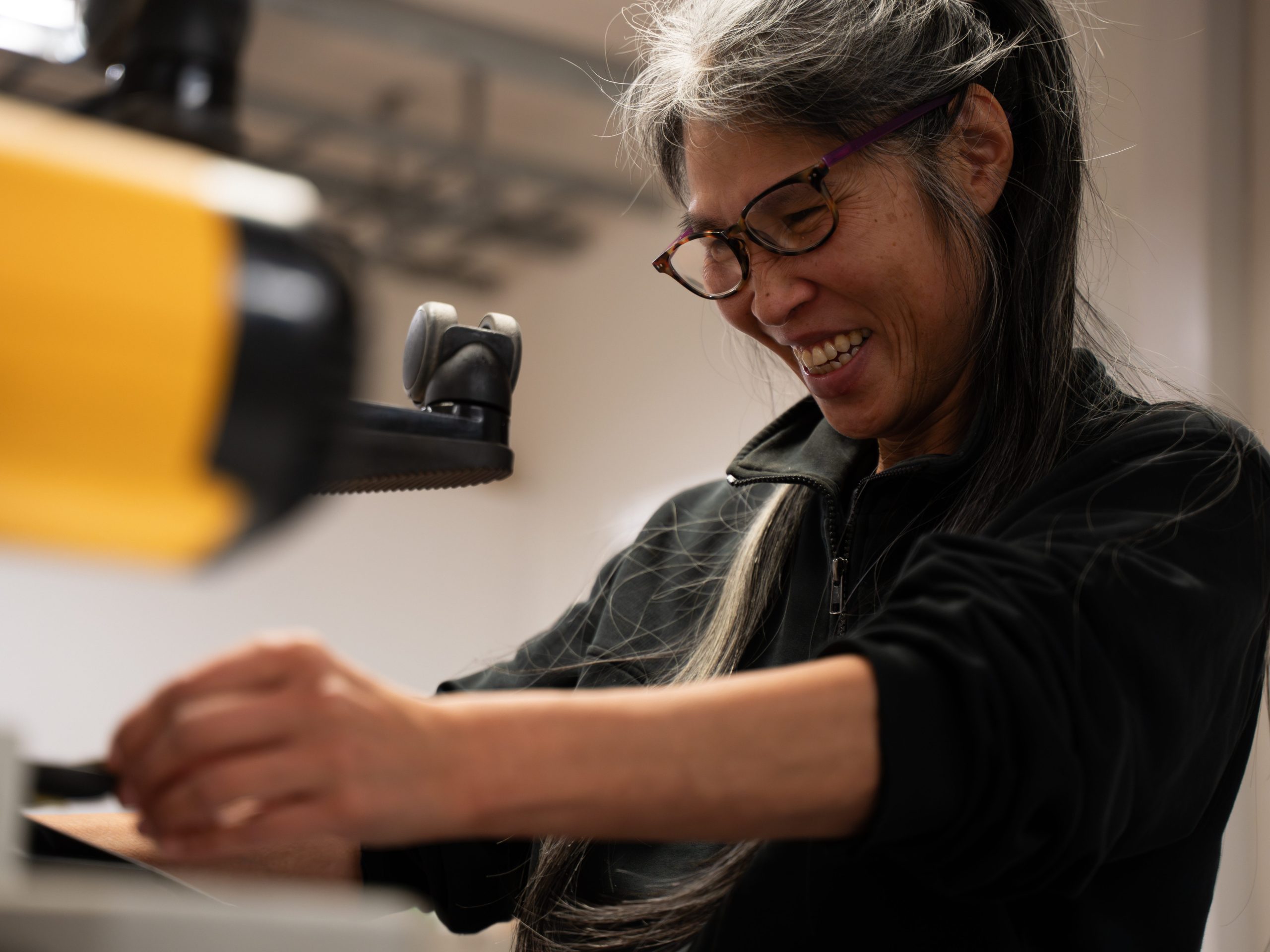 Line Gry Thorkildsen løsner de siste stiftene fra setet på en slitt kontorstol. Trekket er nedslitt etter år med bruk på et kontor tilknyttet universitetet. Hun legger det til side og måler opp nytt stoff.