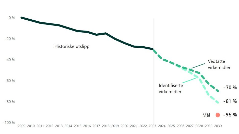 Klimabudsjett 2026 viser at utslippene kan reduseres med 70 prosent i 2030, sammenlignet med 2009-nivå, med vedtatte virkemidler. Figur: Klimaetaten
