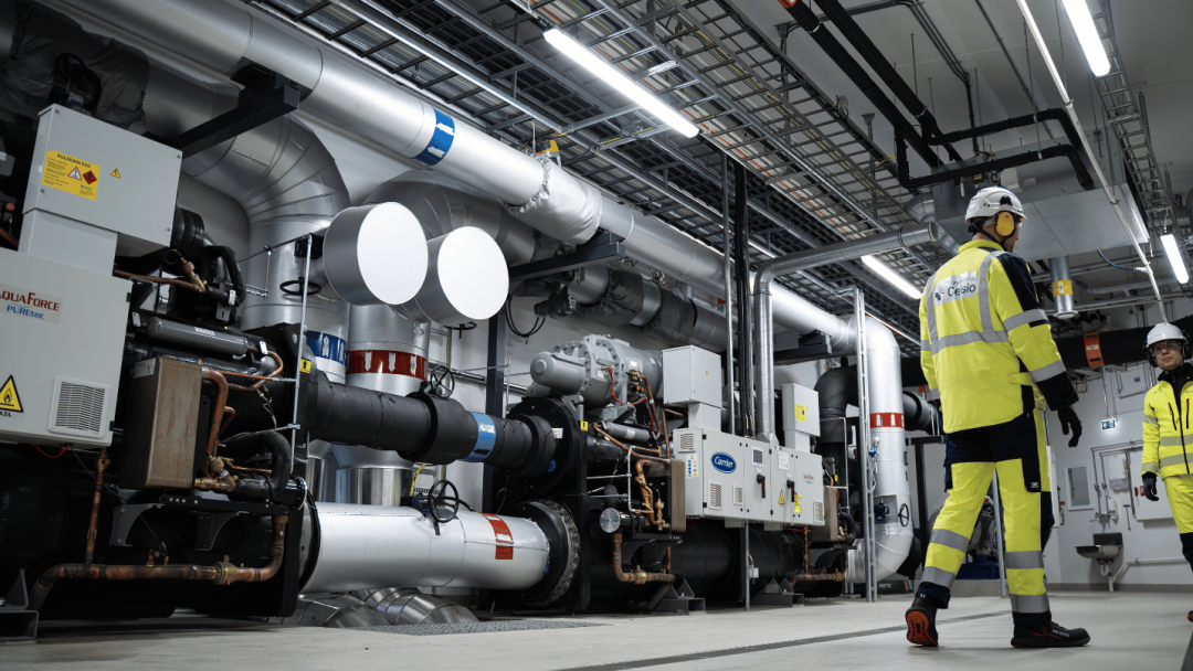 I den ene sirkulerer vann gjennom kjøleanlegget på taket av datasenteret og tar opp varme fra serverne. Vannet kommer til energisentralen på 15–16 grader, og sendes tilbake nedkjølt til 10 grader – klart til ny runde.